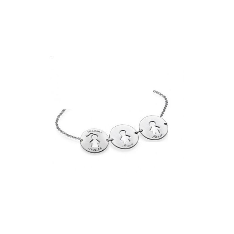 Srebrna verižica s tremi obeski otrok (izrežemo fantka ali punčko) - vpisanim imenom in datumom po želji.