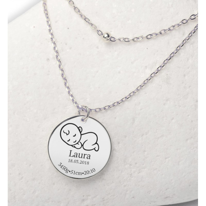 Srebrna verižica z obeskom. Novorpjenček z vpisanim tekstom po želji.