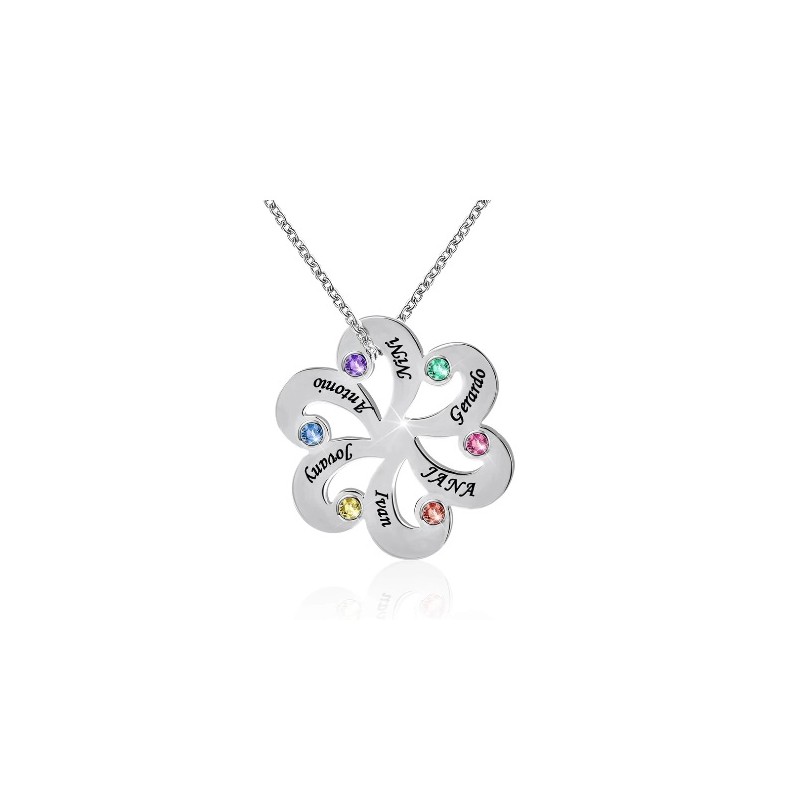 Srebrna verižica s kristalčki in vgraviranimi imeni.
